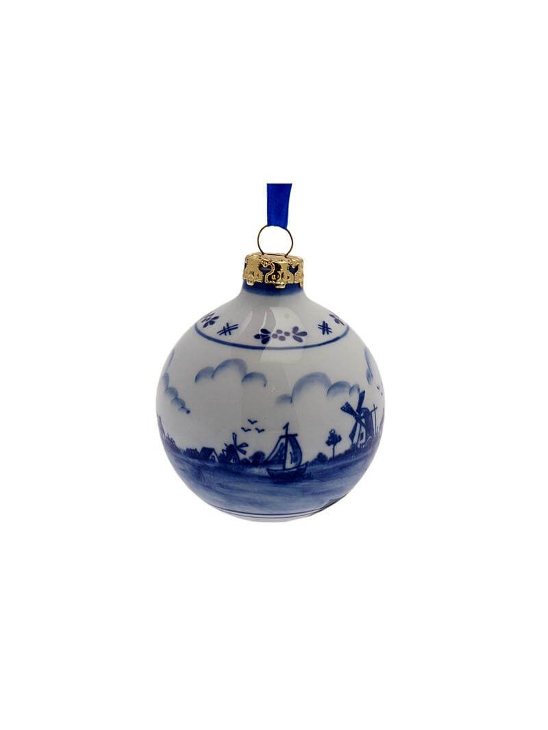 Mooie kerstbal met een doorlopend landschap. Origineel ornament voor in de kerstboom. Formaat: 7 cm Werkwijze: Transfer Gewicht: 85 gr.