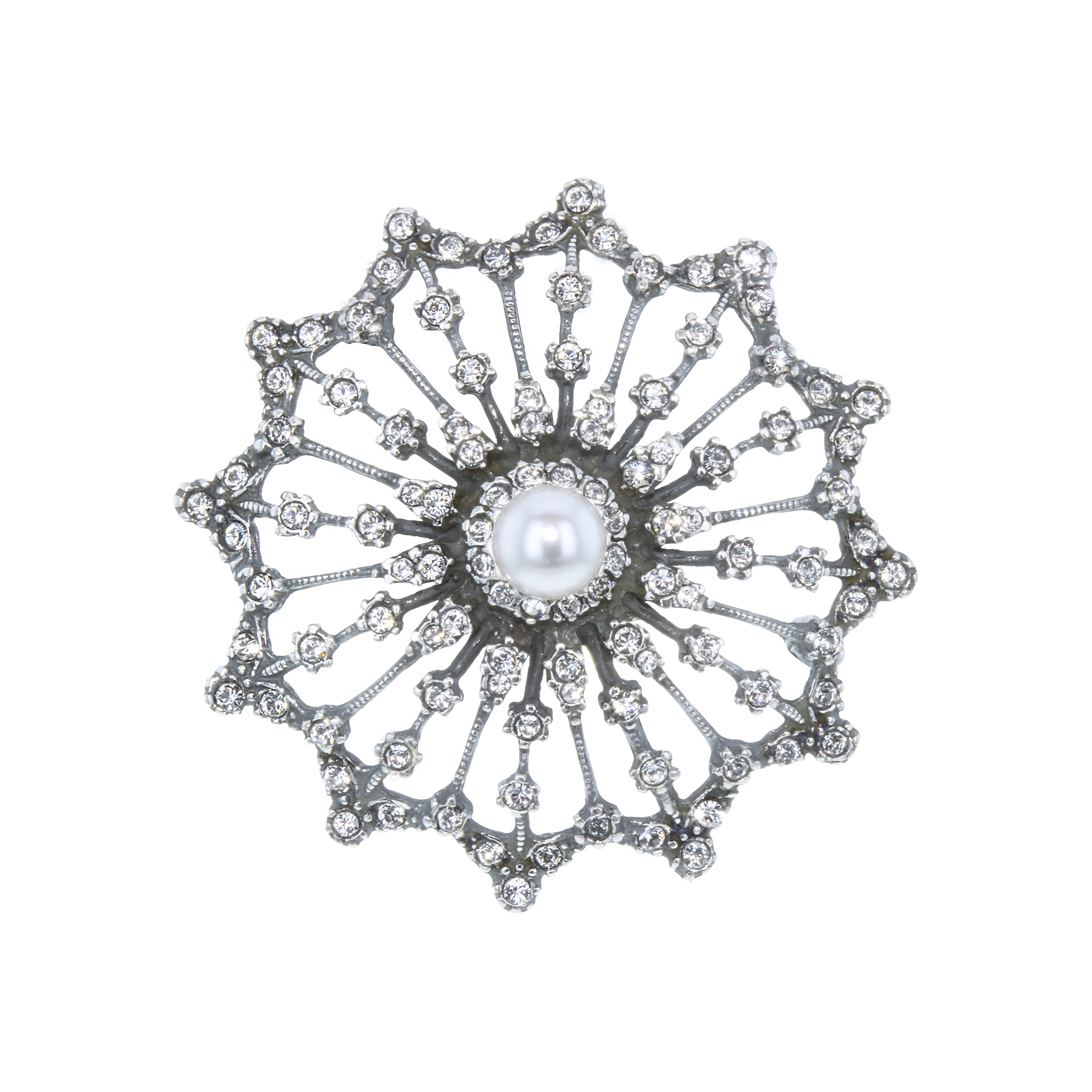 Handgemaakt, sterling zilveren broche vervaardigd in Nederland met de oude mallen van de Koninklijke van Kempen en Begeer. Uitgevoerd met swarovski kristal en een glasparel.