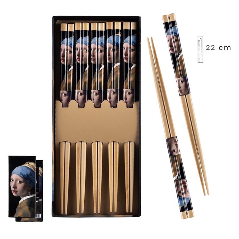 Onze op Vermeer geïnspireerde eetstokjes geven je eetervaring een verfijnd tintje. Elk paar in onze set van vijf is een knipoog naar het Meisje met de parel en voegt kunstzinnigheid toe aan je tafel. Gemaakt voor comfort en stijl, verhef elke maaltijd met een vleugje tijdloze schoonheid.