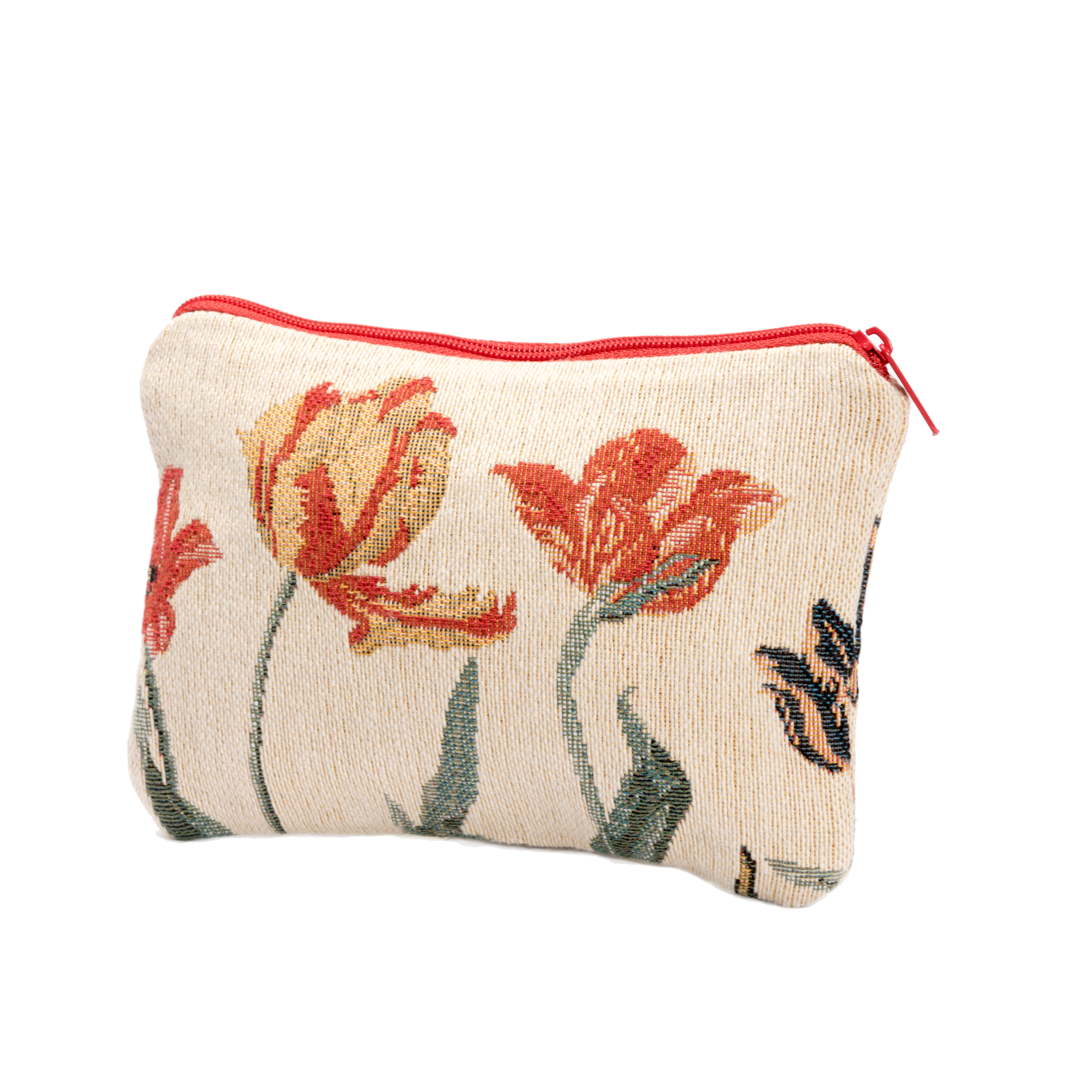 Geweven etui met ritssluiting en met tulpendecoratie op een crèmekleurige achtergrond.