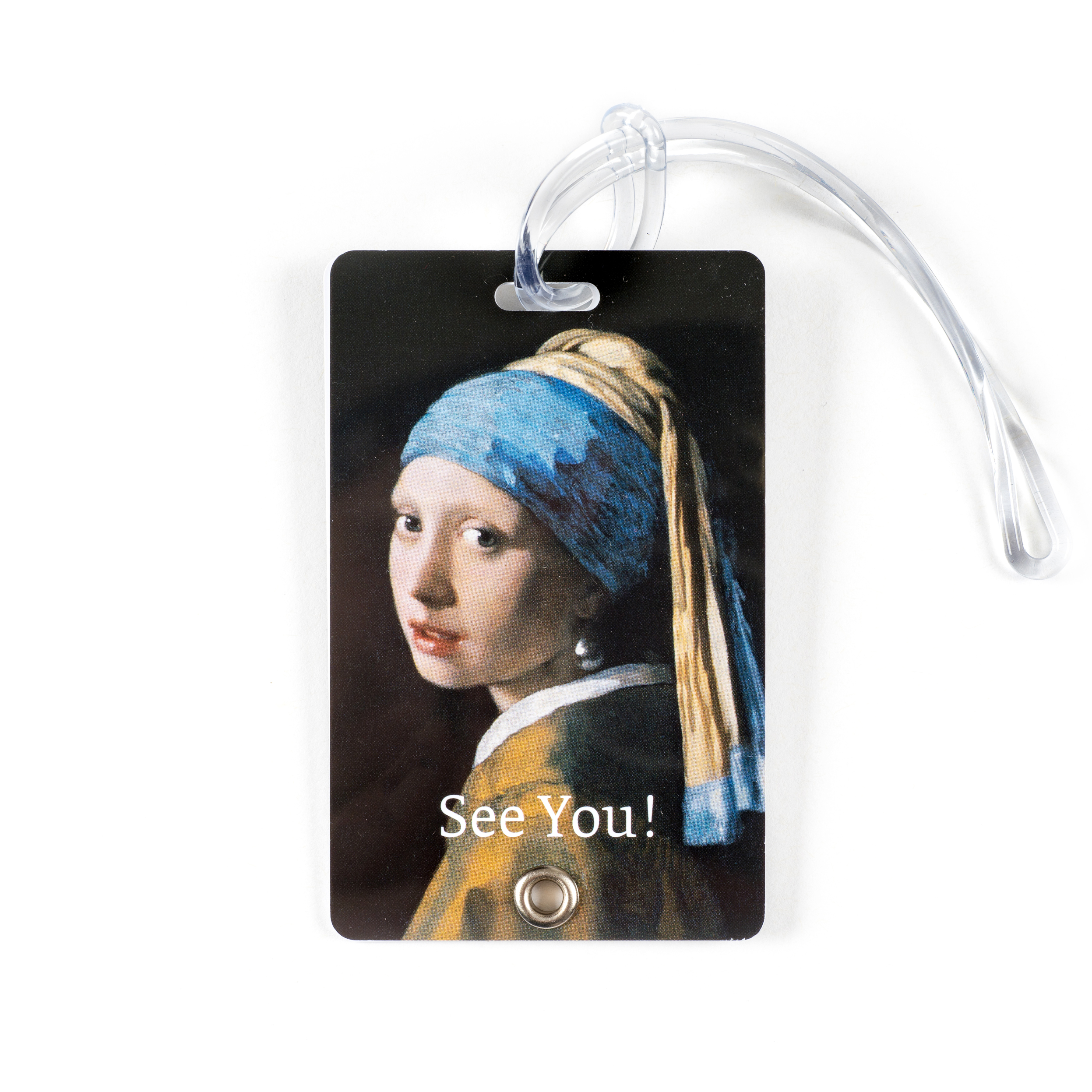 Bagagelabel met een afbeelding van het schilderij van Johannes Vermeer, Meisje met de parel. Aan de binnenzijde kunnen de adres gegevens toegevoegd worden.