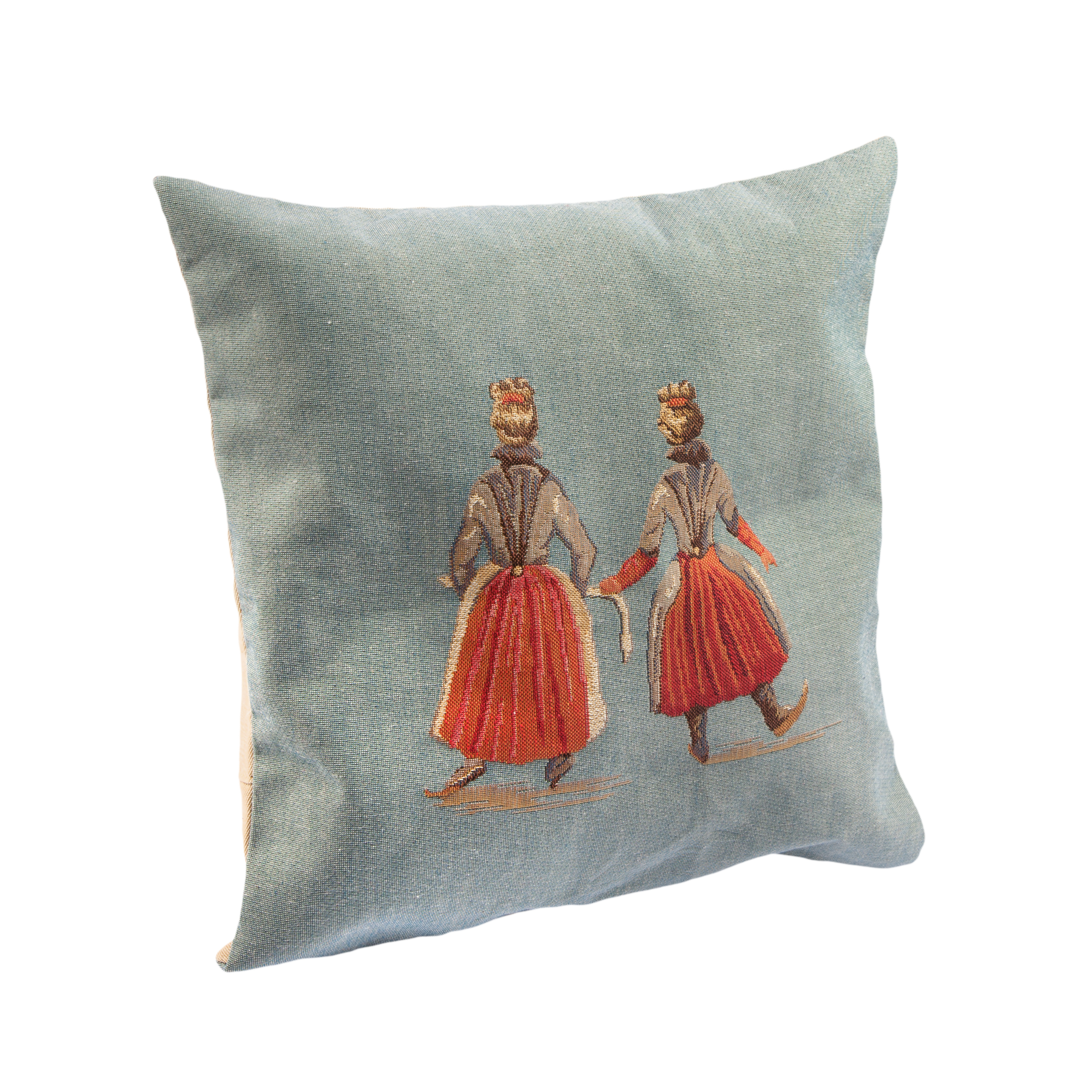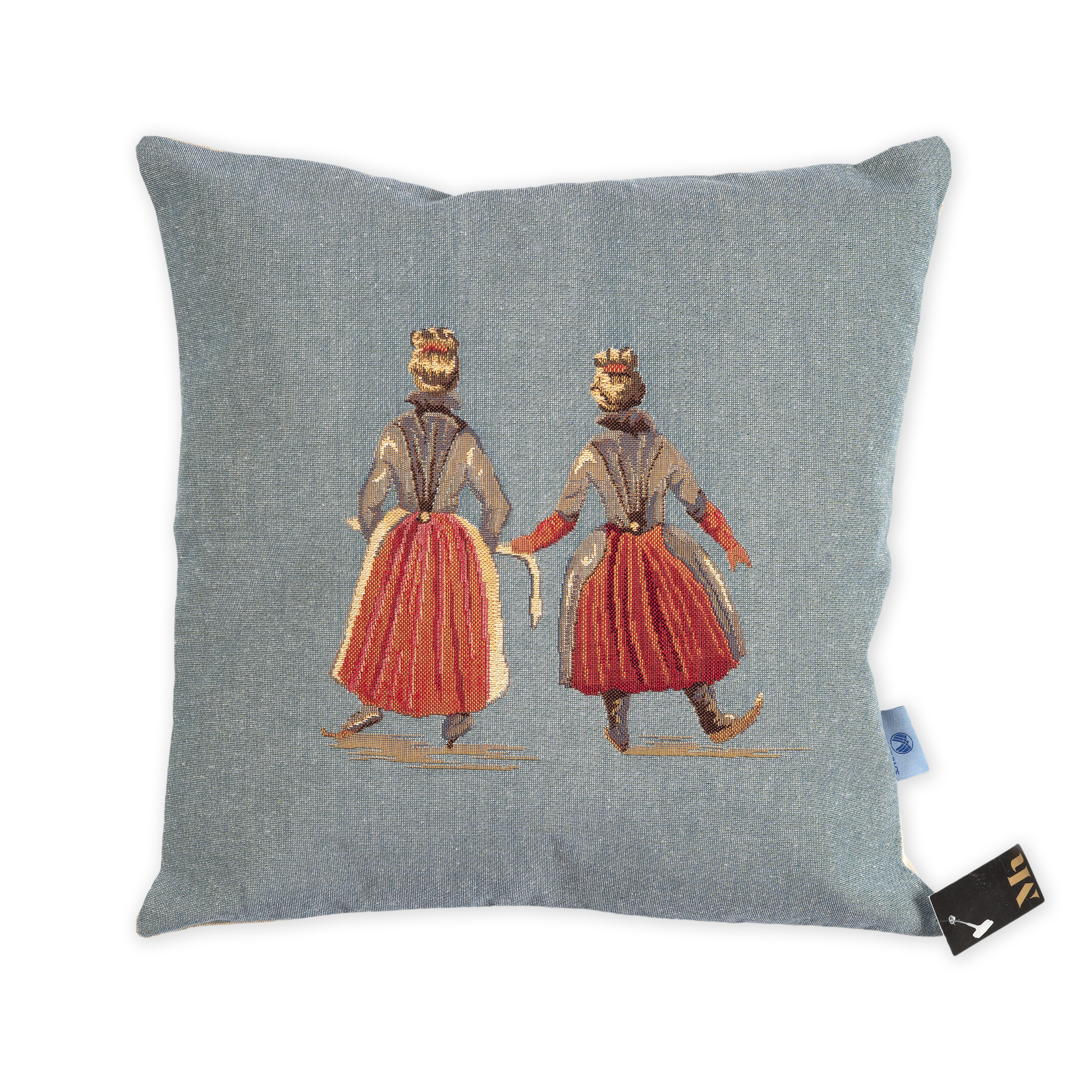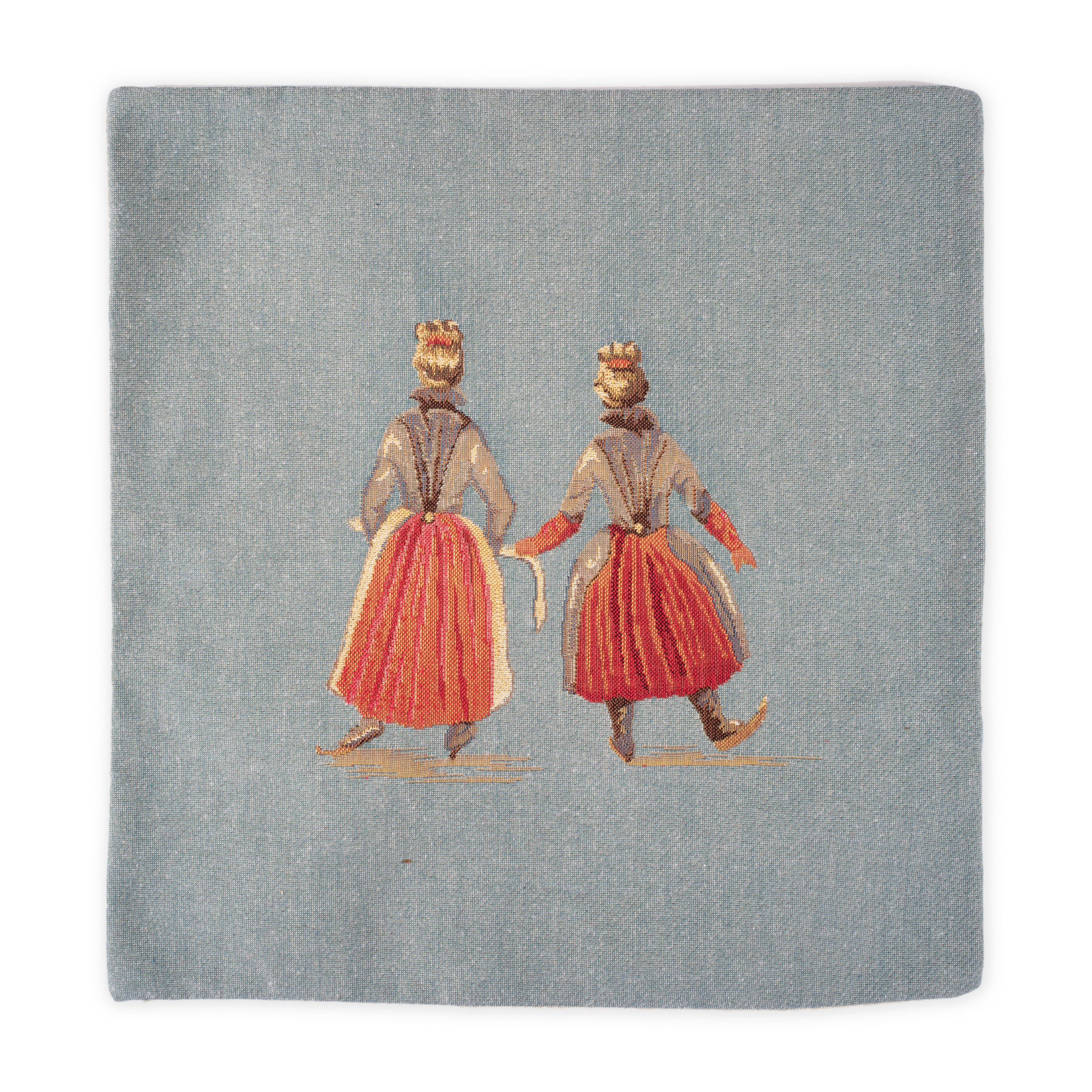 Jacquardgeweven lichtblauwe kussenhoes, met ritssluiting, gedecoreerd met twee schaatssters uit het schilderij IJsvermaak, ca. 1610, van Hendrick Avercamp.
