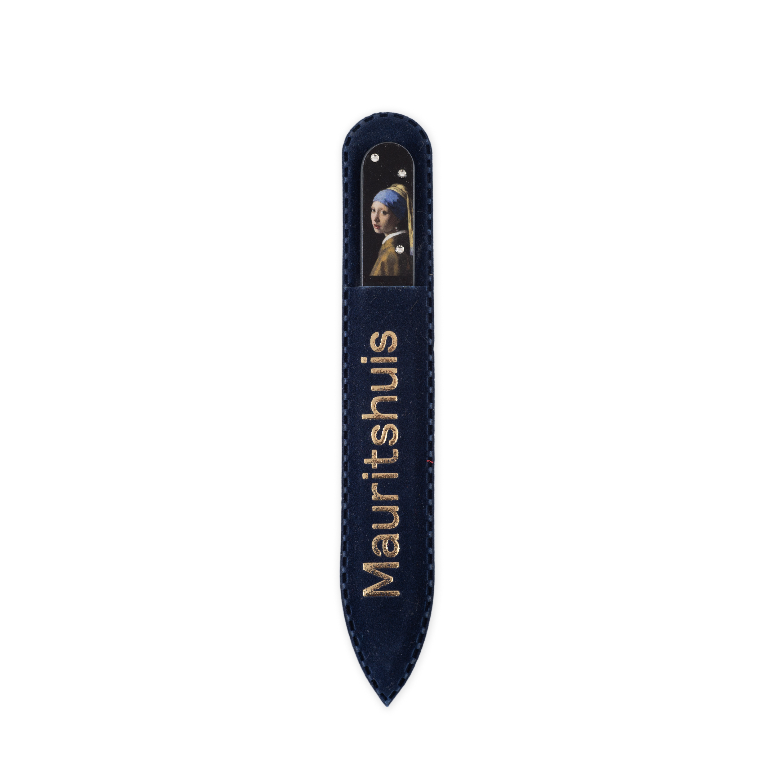 Glasvijl met een afbeelding van het Meisje met de parel en glitter steentjes.De glasvijl heeft een fijne structuur waardoor het beter je nagels beschermt.Slijt niet en makkelijk schoon te houden.Deze vijl wordt geleverd in een mooi donkerblauw hoesje. Afmeting: ca. 12 x 0,8 cm
