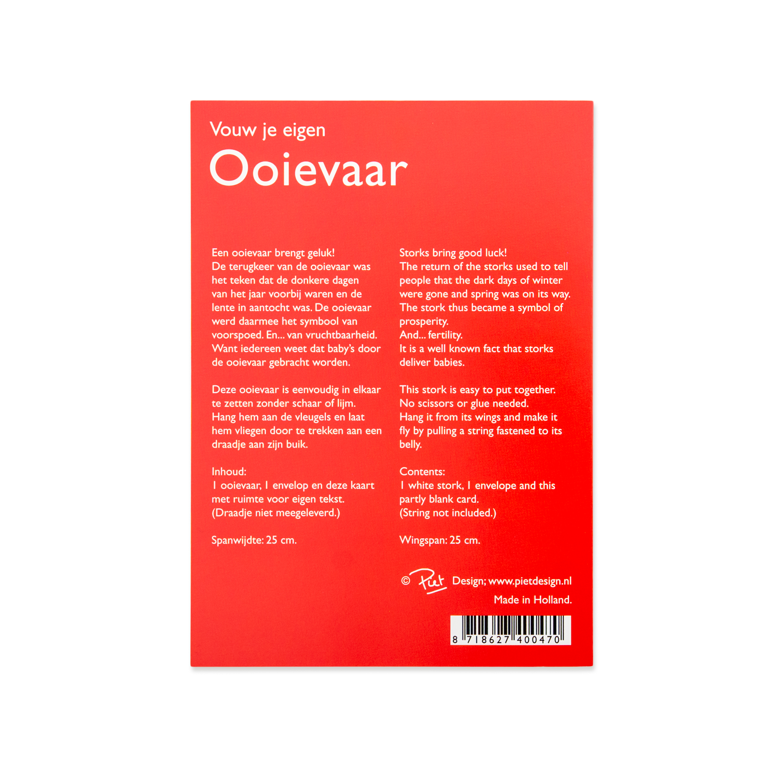 Inhoud: 1 ooievaar, 1 envelop en een kaart met ruimte voor eigen tekst.(Draadje niet meegeleverd.)