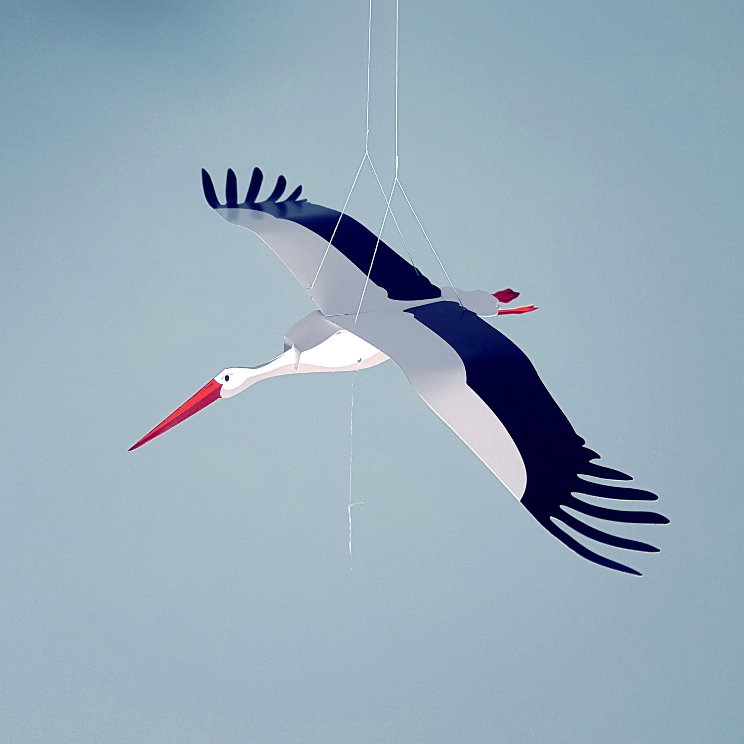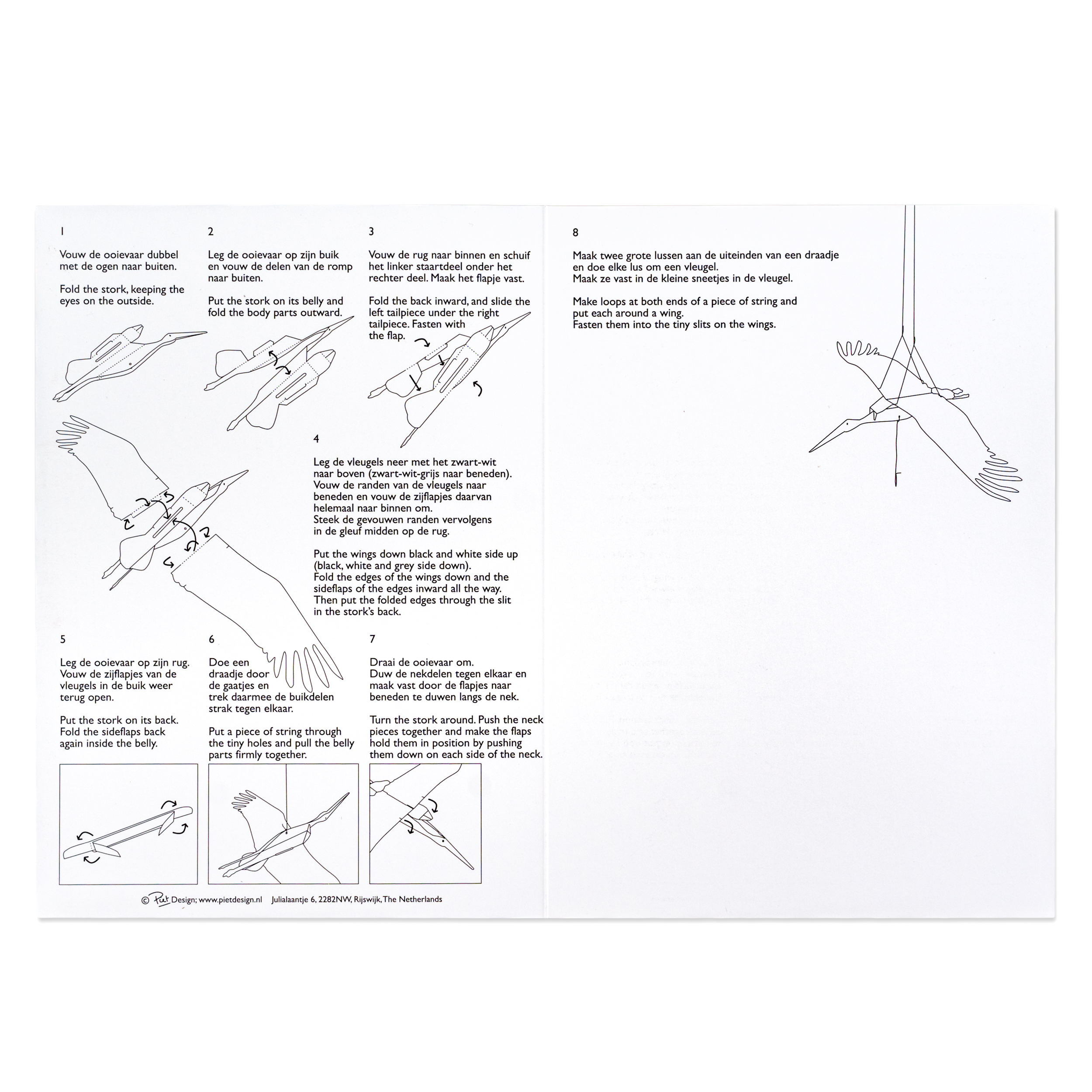Deze ooievaar is eenvoudig in elkaar te zetten zonder schaar of lijm.Hang hem aan de vleugels en laat hem vliegen door te trekken aan een draadje aan zijn buik.