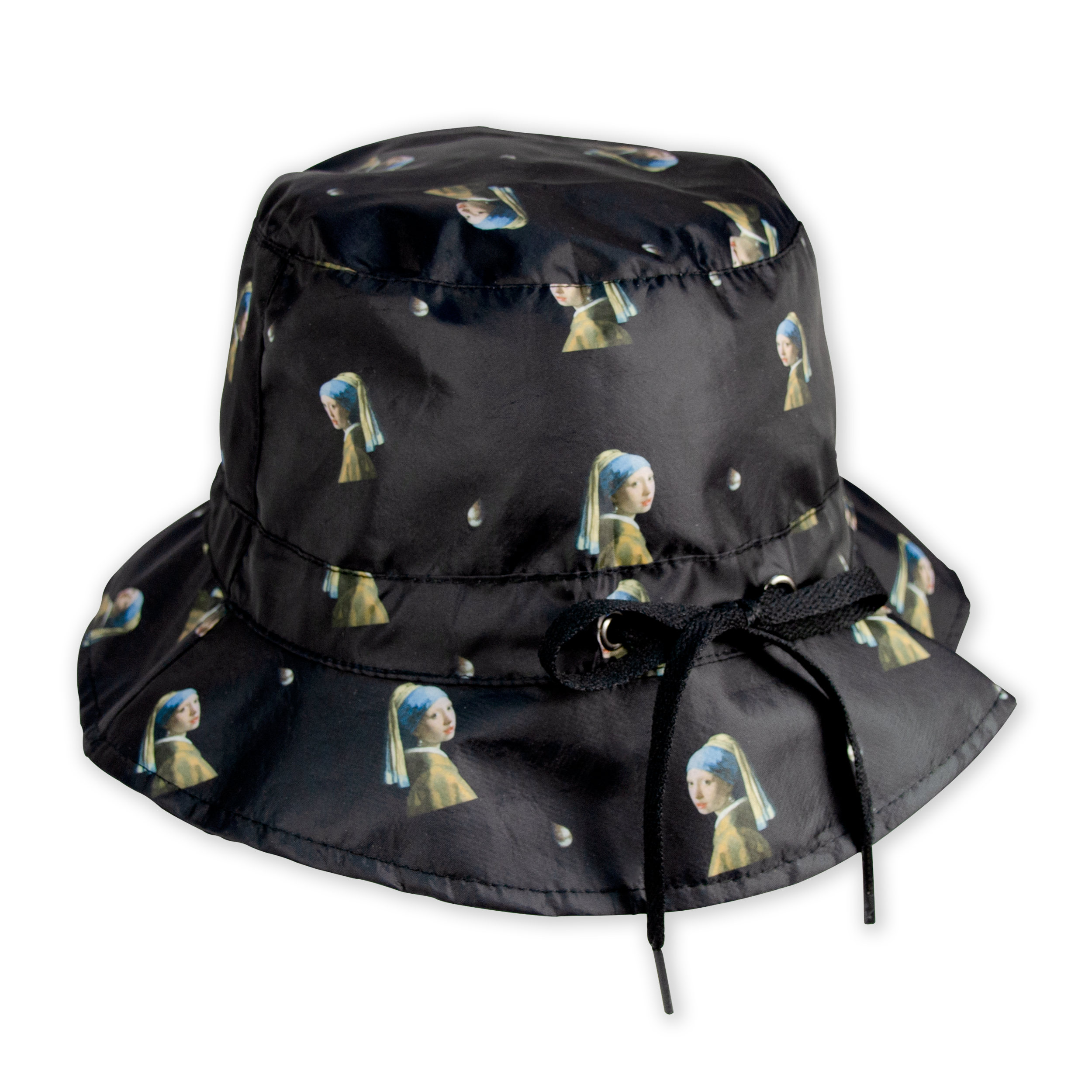 Regenhoed met afbeeldingen van Meisje met de parel / van Vermeer. De ‘ Bucket hat’ is gemaakt van lichte waterdichte stof en heeft het silhouet van een klassiek vissershoedje. De binnenkant is gevoerd en het koordje zorgt voor een goede pasvorm. Hoedje is speciaal gemaakt voor het Mauritshuis.Regenhoed met afbeeldingen van Meisje met de parel / van Vermeer.
