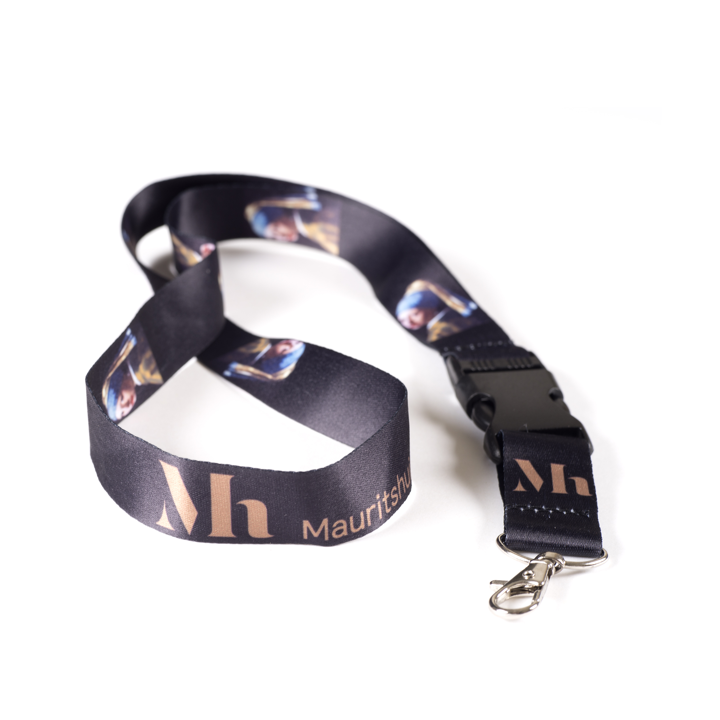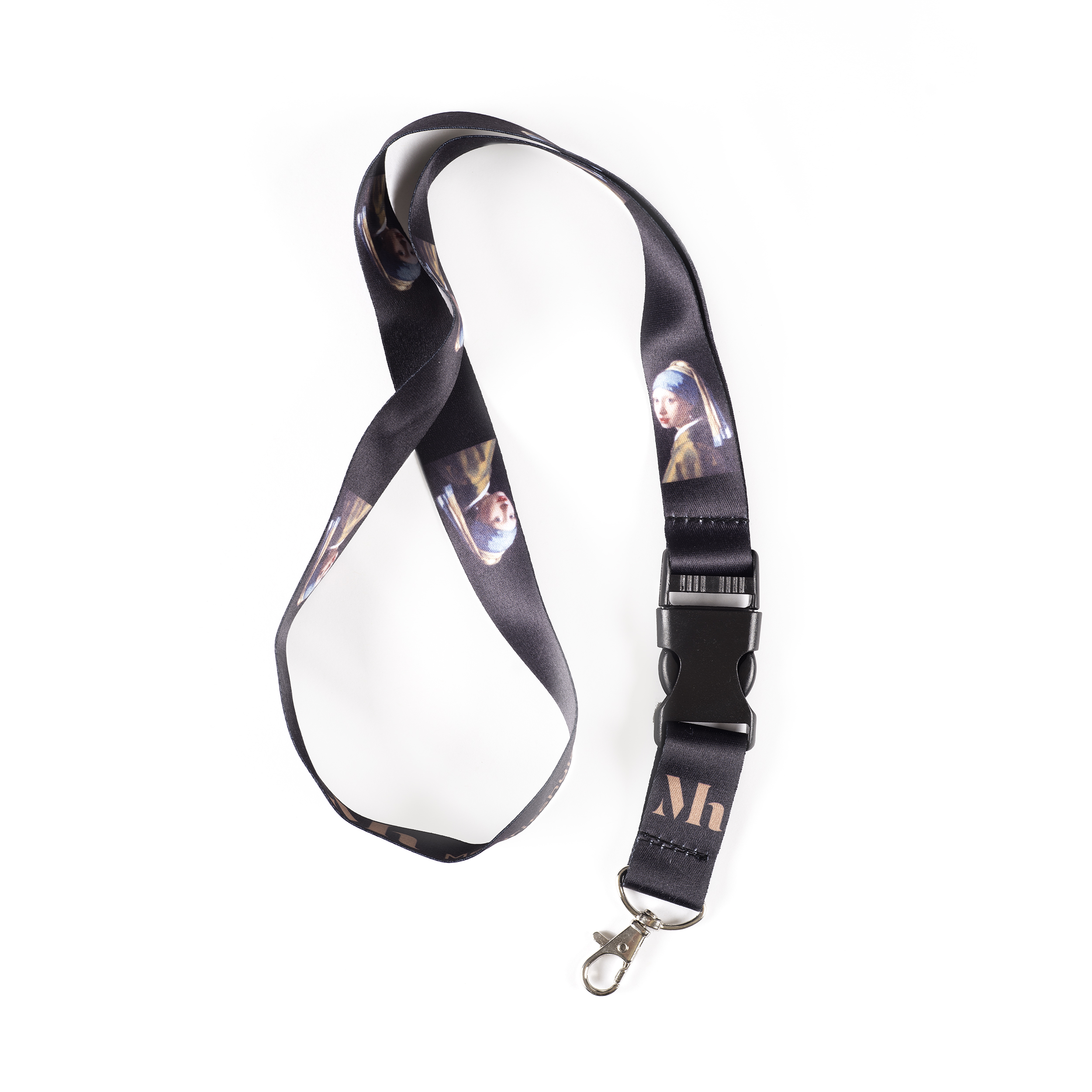 Sleutelkoord met een afbeelding van Vermeer, Meisje met de parel. Het sleutelkoord heeft een afneembare sleutelhanger met een metalen snap-haak.