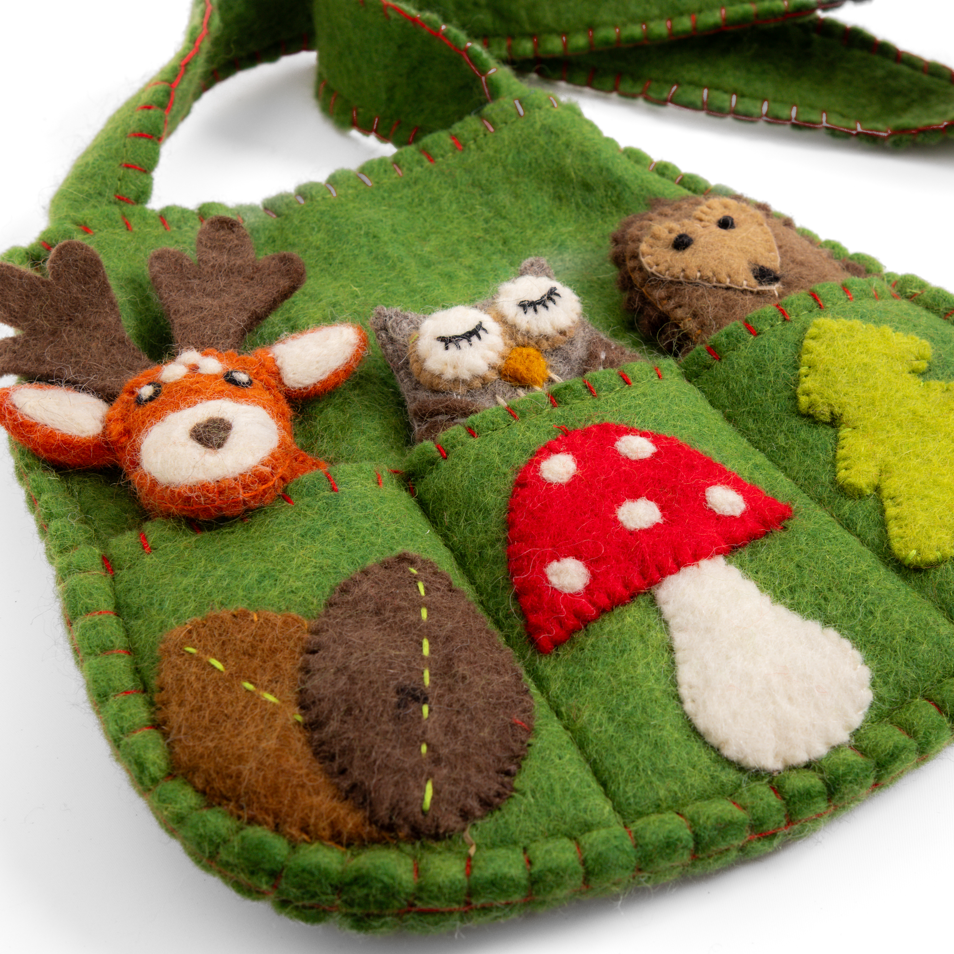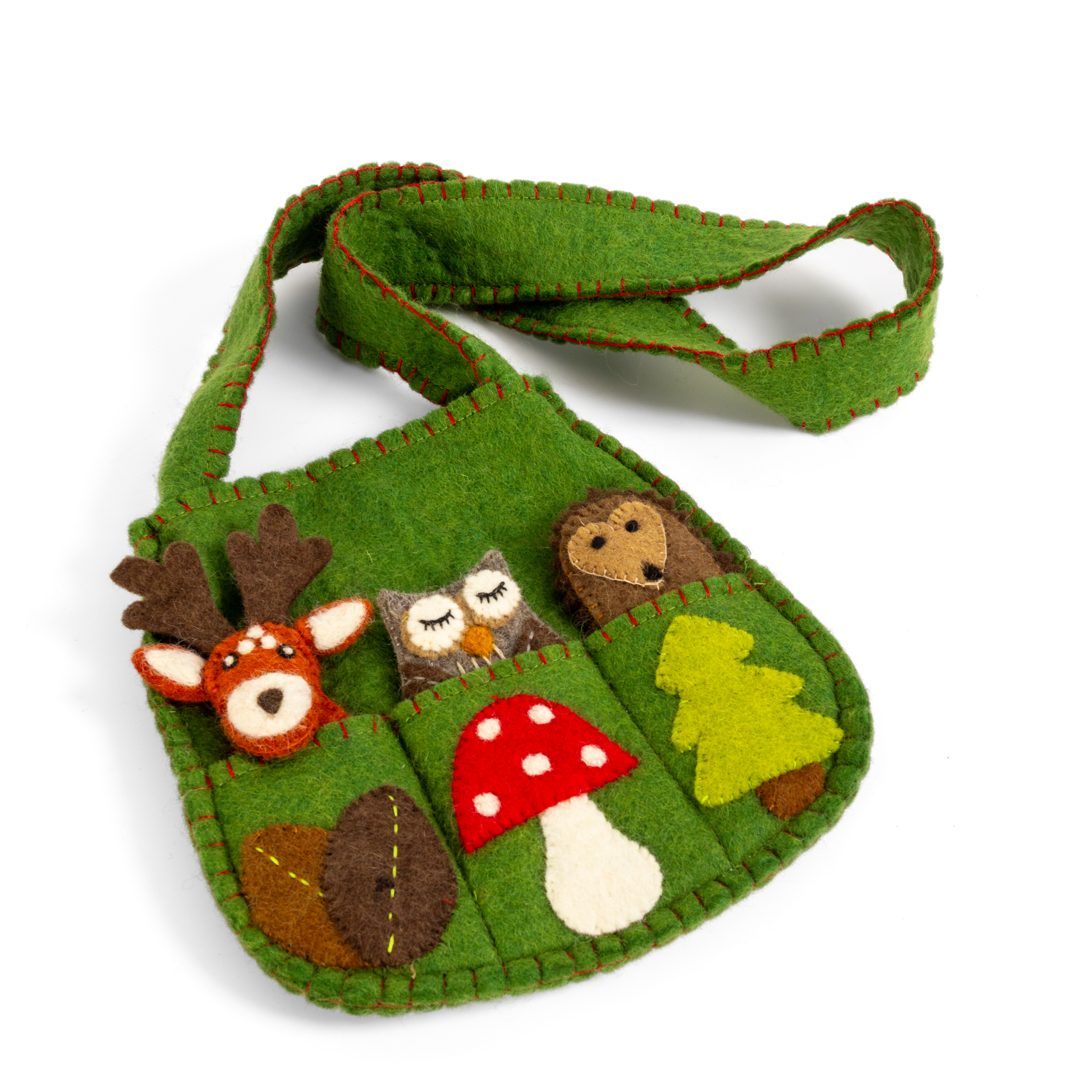 Schatig handgemaakt tasje met daarin 3 vingerpopjes van verschillende bloemen. Op het tasje is een bij, een lieveheersbeestje en een bloem van vilt genaaid. Het tasje is voorzien van een hengsel en drukknoop.