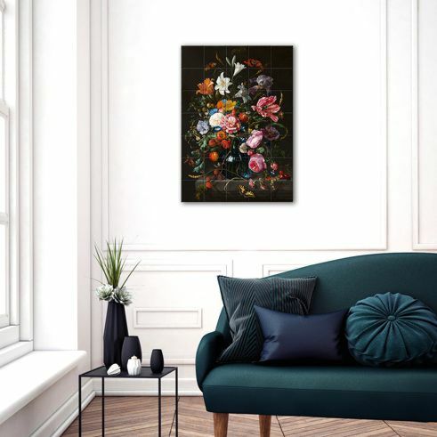 In Nederland kennen we een lange en rijke traditie in het maken van keramische tegeltableaus. In navolging van deze traditie hebben wij een reproducties van de Vaas met bloemen van de Jan Davidsz de Heem laten maken. De tegels zijn op een MDF-plaat bevestigd en eenvoudig op te hangen.