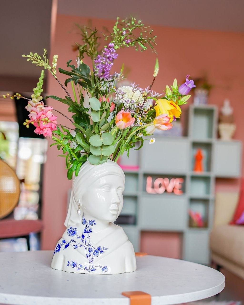 Deze vaas komt in de vorm van een schitterende buste van het Meisje met de parel. We hebben het bekende portret uit het schilderij van Johannes Vermeer gehaald en haar omgetoverd tot een driedimensionaal borstbeeld, inclusief parelachtige oorbellen aan beide kanten. Bovenop, in haar hoofddoek, zitten gaten waarin de verse bloemen gestoken kunnen worden. Een buste is van oorsprong een beeldhouwwerk dat bedoeld was als tegenhanger van een geschilderd portret. Het was een kunstvorm die vroeger alleen gebruikt werd voor rijke of historische personen. Met deze buste komt het Meisje met de parel nog meer tot leven en kun je haar eindelijk in 3D bewonderen. De vaas is glanzend wit en gedecoreerd met Delfts blauwe bloemen. Geef haar een schitterende plek in huis.