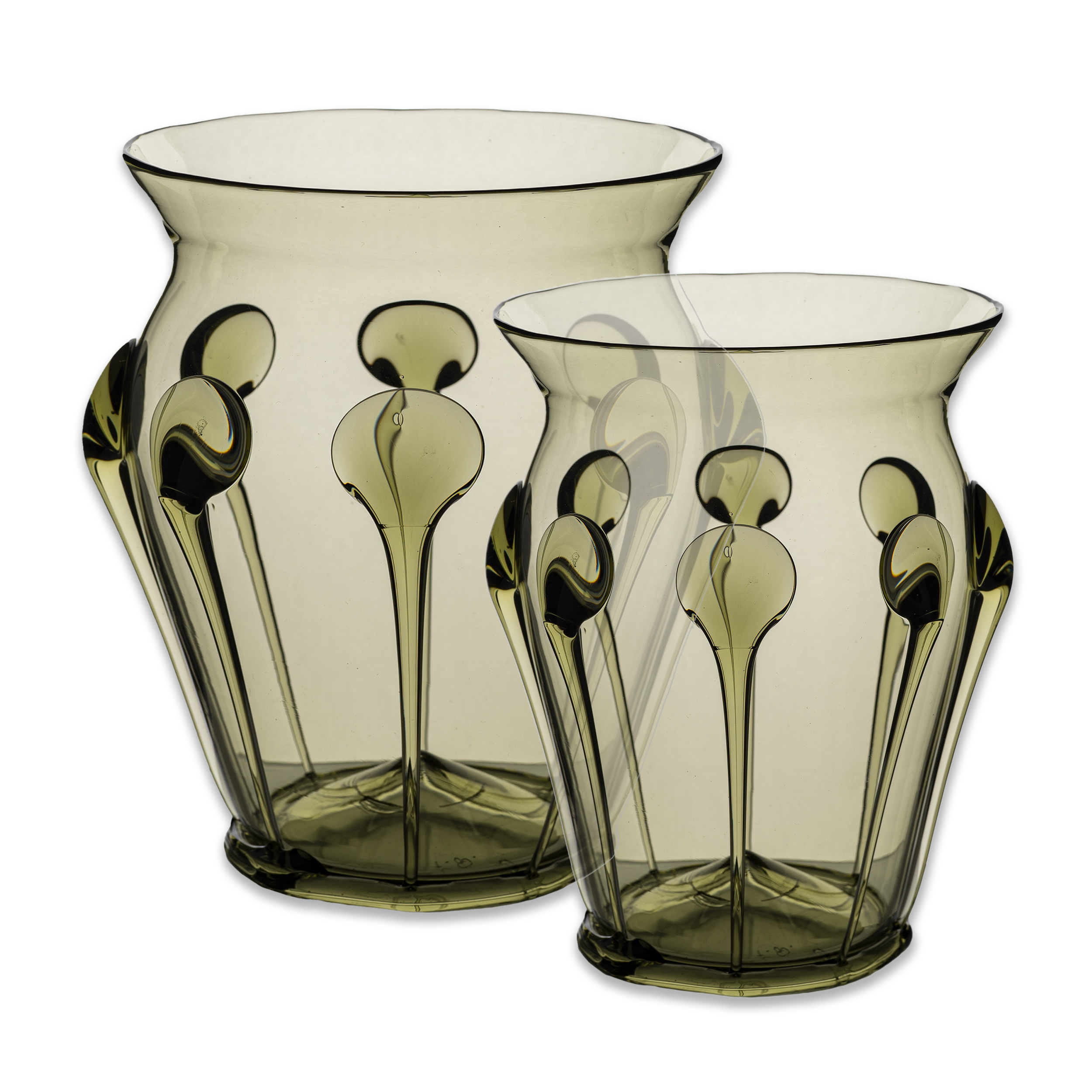 Bosglas ( Waldglas) kwam uit het bosgebied van Midden – Europa waar de benodigde grondstoffen onder handbereik waren.Potas uit asresten van beukenhout, adelaarsvarens en wat ijzeroxide gaven het bosglas de kenmerkende groene of bruine kleur.De noppen en bramen aan de buitenkant van het glas zorgde voor een goede grip.De mondgeblazen glazen kunnen qua vorm en kleur verschillen en hebben soms luchtbellen.Onze glazen replica’s uit de 17e eeuw komen uit Tsjechië.