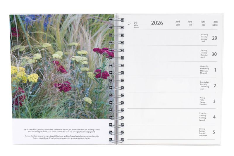 Geniet het hele jaar van prachtige tuinfotografie met deze spiraalagenda van Modeste Herwig. Iedere week toont een sfeervolle foto van kleurrijke bloemenborders, weelderige planten en inspirerende tuinhoeken. De overzichtelijke weekindeling biedt genoeg ruimte voor afspraken en notities, terwijl de stevige ringband ervoor zorgt dat de agenda altijd mooi open blijft liggen. Perfect voor tuinliefhebbers én als groen cadeau-idee.