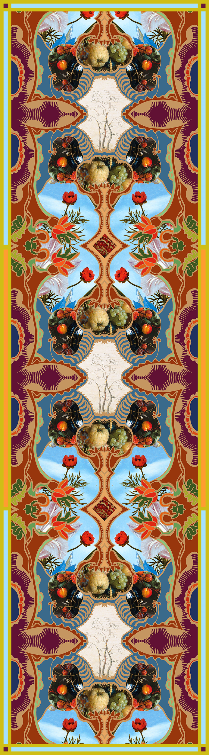 De sjaal is een ode aan de schilderkunst van het Mauritshuis in Den Haag. Bij nader inzien ontdek je prachtige details uit meesterwerken van de collectie, verwerkt in een weelderig en harmonieus ontwerp. Van florale motieven tot stillevens – elk element is zorgvuldig gekozen en samengebracht in een symmetrisch patroon dat zowel klassiek als modern aanvoelt.